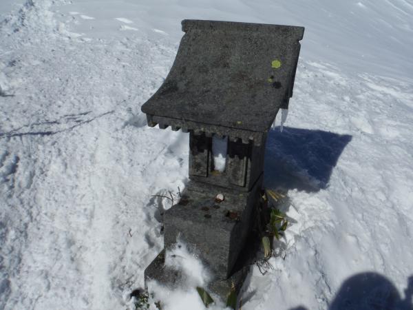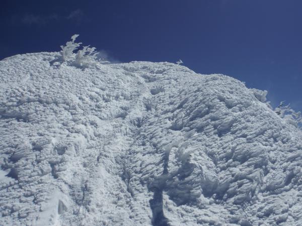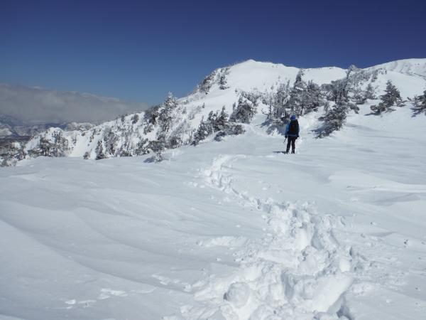 剣ヶ峰山というだけあり遠くからは尖って見えるので、下りはかなり急でした。稜線上をずっと歩くので登り以外は冷たい風が容赦なく吹き付けてきます。やはり今回も顔周りの防寒はバラクラバ&ニット帽でしっかりと。道はガリガリに凍った場所は無く、靴底が程よく雪面に食い込み全体的に歩きやすかったですが、そうかと思うと風の当たらない登りではずぶずぶ腰まで潜り、思ったより変化に富んだコースでした。