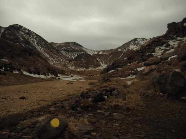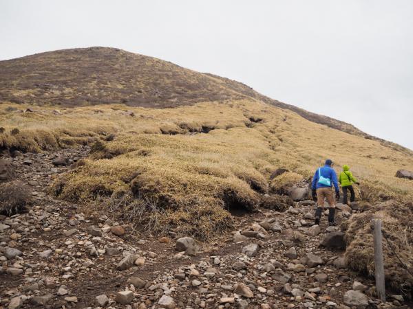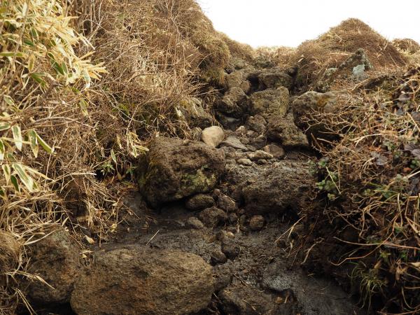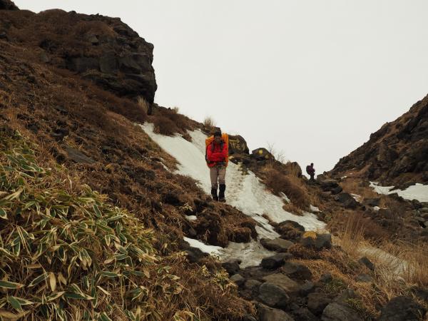 今回は九重で最も王道ルートである"長者原"から入山。緩やかにコンクリート道を歩きながら"諏峨守小屋"に向かう。一か月も経つとさすがに雪の姿はどこにもない。代わりに水分をこれでもかというほど含んだ土道に登山靴を置くとソール分以上に埋まってしまう。もうヌルヌルで滑ることこの上ない。慎重に体重移動を繰り返しながら登ると林道に出る。ようやく地面の感触が足裏に戻る。