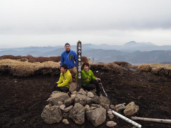 基本的に地面が柔らかい。フワフワで滑りやすい。石に乗るとその石が沈む始末。"見た目通り"ではないため一歩ずつ確認しながら体重を移す。まずは"三俣山西峰1676m"、次いで下って登り返し分岐を左に進むと"三俣山本峰1744m"だ。相変わらずの曇天だが、ガスってはいないので展望は悪くない。そして無風状態。一か月前の"山頂強風滞在5分"とは真逆状態。さらに天気もあるだろうがやっぱり時期だろう。どっちの山頂も貸し切りだ。ゆっくりと過ごしたいがそんな空模様でもないので小屋に戻るとする。