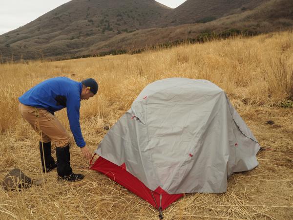 今回のテント場は"坊ガツル"。使用テントは、酒井「アライテント/トレックライズ2」、宗「MSR/エリクサー2」、小橋「ニーモ/クナイ2P」をそれぞれ設営。