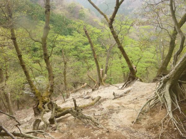 展望岩の核心部はザレた急斜面です。土も岩も木も全てが脆いです。