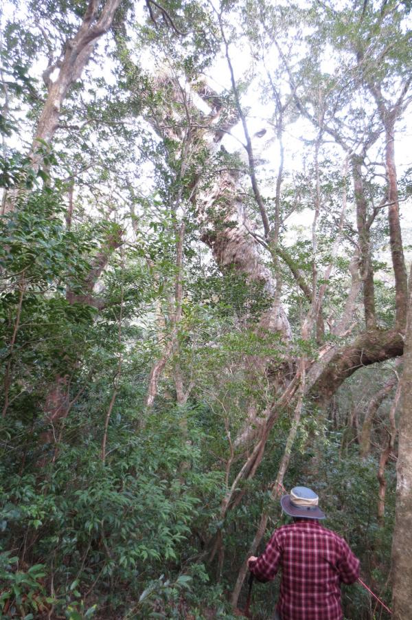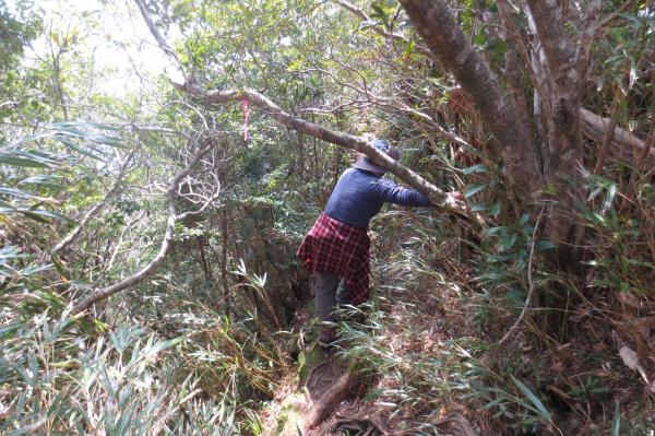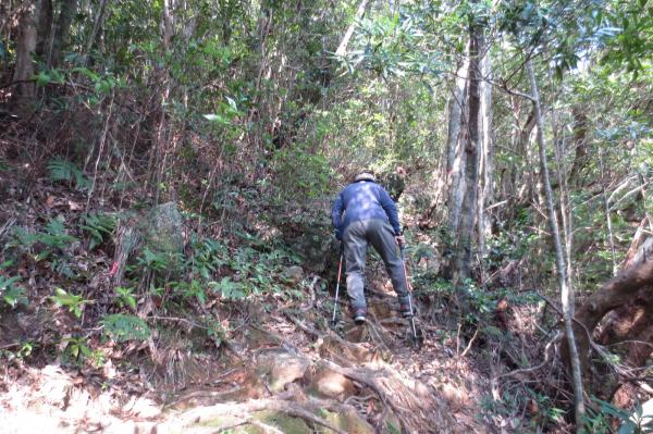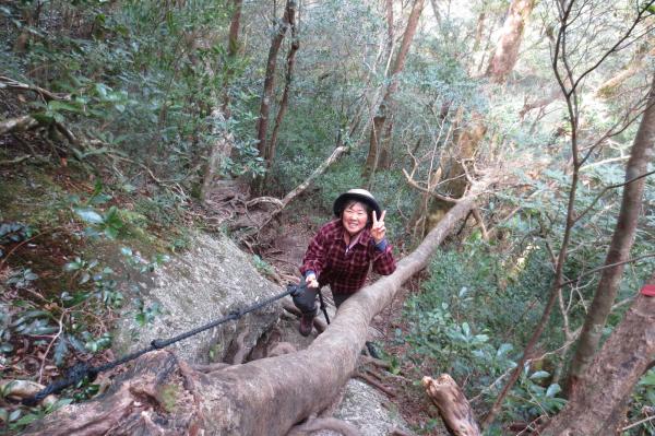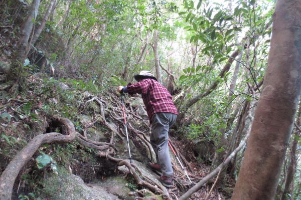 登山口から急激な登り! 万代杉まですぐかと思いきやアップダウン激しく、時にロープに頼りながら進みます。隊長は途中でストックをデポ。三点支持して歩かないと危険!