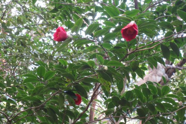 ヤクシマツバキがたくさん咲いていて、緑の中の真紅が映えます。