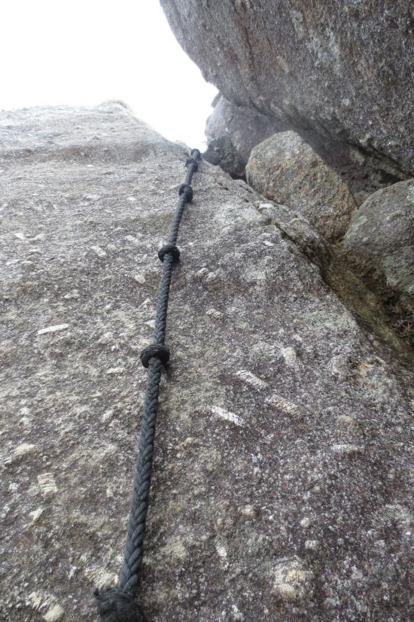 やっと展望台です。ここでパンやおやつを食べて気合を入れます。すると、隊長が「あの頂上には登れない!危険!」と騒ぎ出します。よーくみるとモッチョム岳山頂には大きな岩が! ロープが垂れ下がっている! たしかにスラブ状に見える岩です!