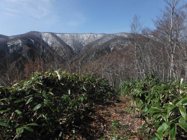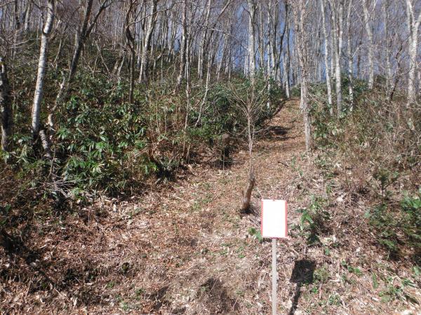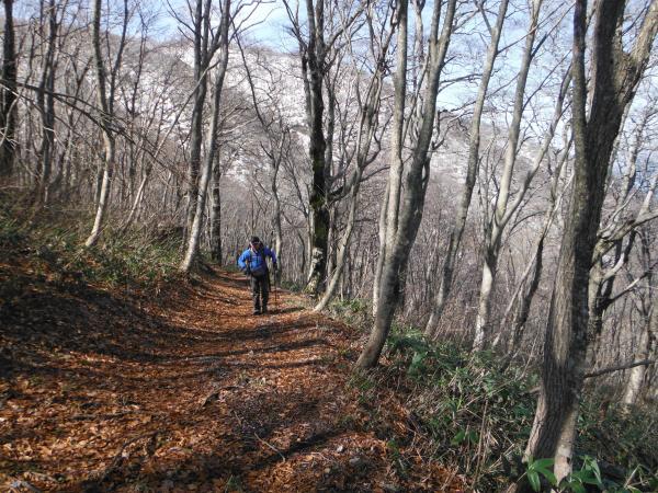 地蔵尊展望台まで県境の尾根伝いに歩くのですが、登山道は整備されており、道に迷う心配もなく快適に歩けます。新緑の前なので、木々の間から大万木山も見えます。登りはじめと途中にやや急斜面があるので、雨の時は滑りやすく注意が必要です。