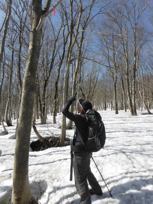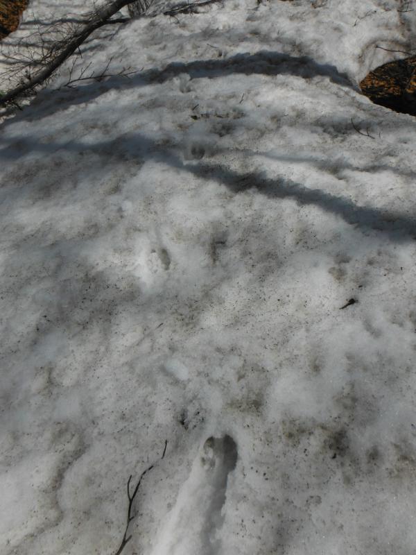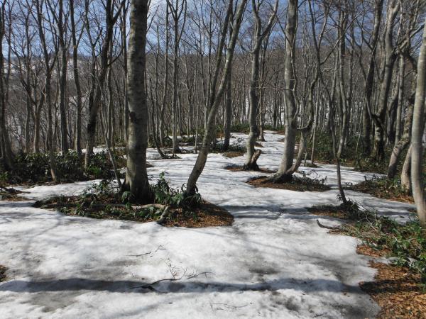地蔵尊展望台からは徐々に残雪が増え始め、所々登山道を横切るように残雪があるので、慎重に歩きました。山頂手前はまだまだあたり一面に雪が残っていましたが、今回はアイゼンは使わず歩けました。