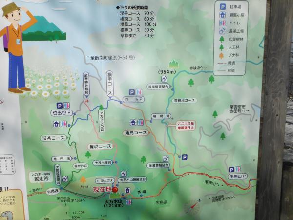 - 毛無山駐車場(35分)地蔵尊展望台(40分)大万木山山頂(50分)毛無山駐車場