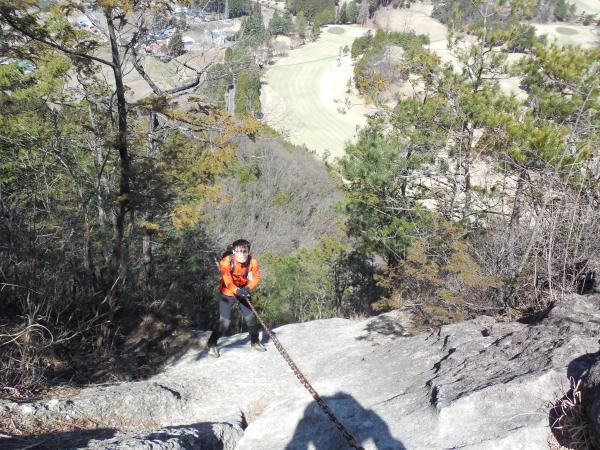 今回は岩も乾いていて良い状態なので、鎖を頼りに降りていきます。滑りにくい手袋をしていたほうが良いと思います。3本の鎖を渡って降り切れば、もうゴルフ場わきに到着です。