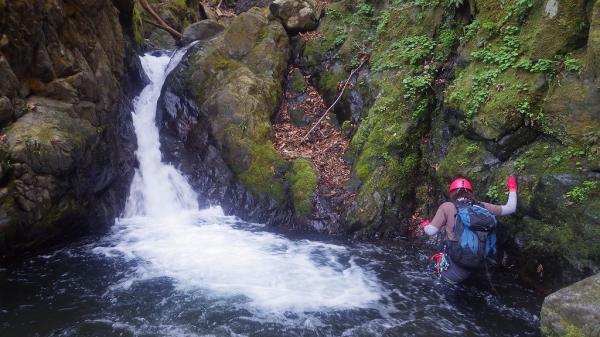 1つ目の滝は右壁を登るのですが、ぬめっとしてて手がかりがあまりないので慎重に。