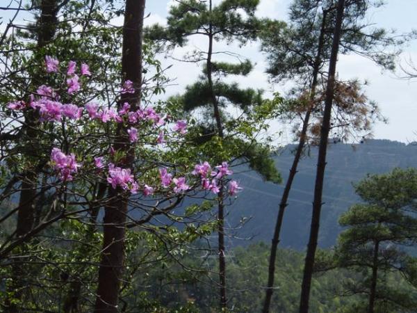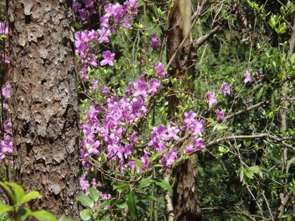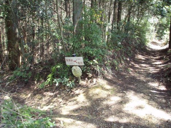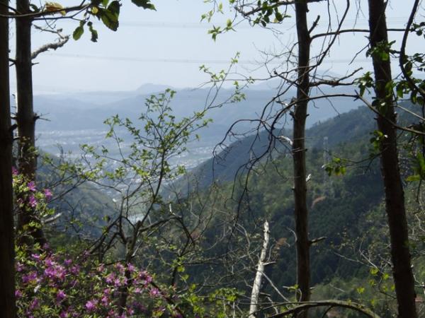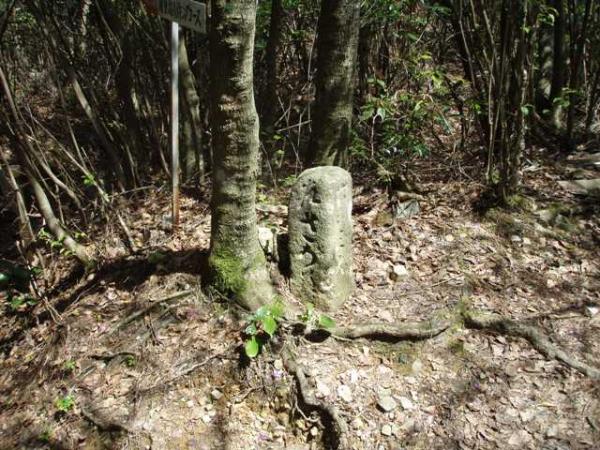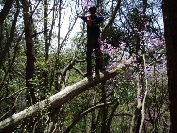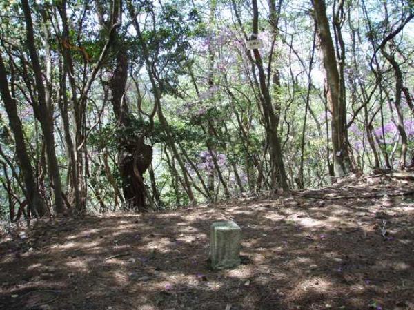 すぐに道を塞いでいた倒木を乗り越えると、後は歩きやすい山道が続いていました。朽ちた標識を見た後にしっかりした標識がある分岐に出て、少し行くと「明智越」への標識を発見。そのまま登り方向の山道を進む。所々にツツジが咲いており、春の訪れを感じられました。
