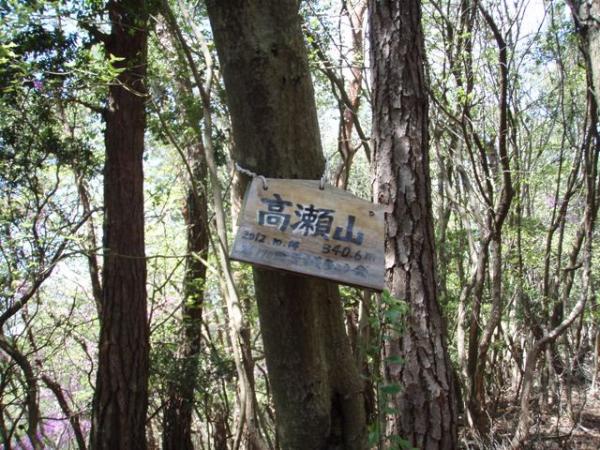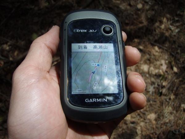 出発から1時間ほどで高瀬山の山頂に到着。三角点あり、展望無し。気温15度。風が通って涼しい。GPSの画面を見ると、少し山頂の位置がズレておりましたが、なかなか良いナビゲーションシステムです。