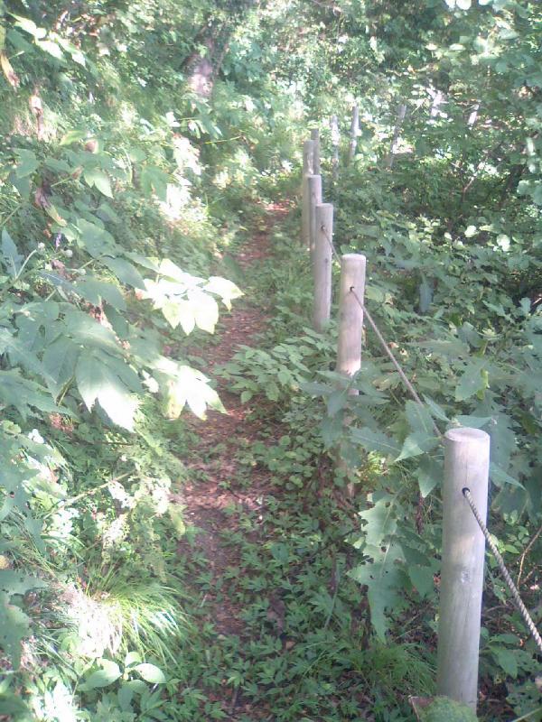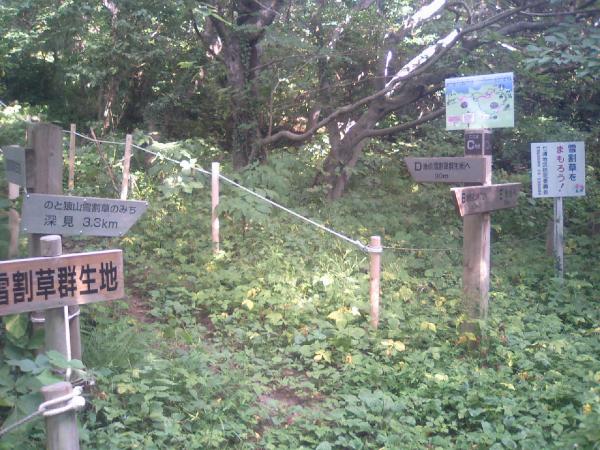 3月~4月には雪割草の群生地として有名な猿山ですが、この季節は訪れる人も比較的少ないようです。遊歩道も夏で日差しが良く下草が多い様子。山頂は狭く視界も開けていません。時間的にはさほどかからないので、夏の海の景色を楽しみながらドライブのついでに立ち寄ってみるのも良いでしょう。また、門前町深見からの3.4km自然歩道コースでは環境保全のため協力金300円が必要です。観光シーズン中は娑婆捨峠駐車場でも協力金が必要かもしれません。