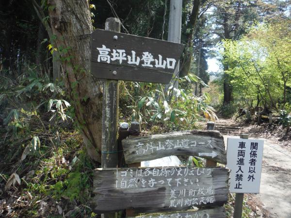 駅に降り立つと、新緑とまだ少し残る山桜に覆われ、すっかり春に着替えた高坪山がお出迎え。さあ目標に向かってスタート!しかしお天気が良かったので車道歩きは暑い暑い(;´д`)ひぃふぅ言いながら民家を通り抜け、田んぼに沿って歩いていくと、野球場や陸上競技場を有したあらかわ総合公園に着きます。道路はそのまま山に向かって伸びており、坂を登ってゆくと登山者用の駐車場があり、さらに進むと漸く右手に登山口が現れます。登山口入ってすぐにトイレがあるので安心です。