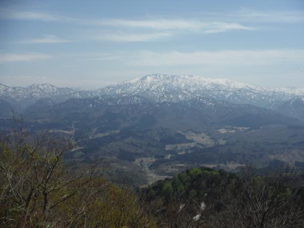 途中から左手に、雪のだいぶ落ち着いた光兎山と鷲ヶ巣山、後方にはまだ真っ白な朝日連峰が輝いていました。分岐の虚空蔵峰まで来て、ここから右に行くと高坪山へ至りますが、距離を稼ぎたかったのと朝日連峰をもっとよく見たいと思って、左手の荒島城コースを進んでみました。しかし行けば行くほど展望が無くなったので三角点のある場所まで行って引き返し、飯豊連峰展望台を目指しました。名前の通り、残雪の飯豊連峰が眼前に広がりお昼休憩にはもってこいの場所でした。荒川方面の集落も眼下に広がり、そこからすくっと伸びる朳差岳と飯豊前衛峰の二王子岳はその白さが際立っていました。今年は胎内から飯豊に入ってみたいなぁ~なんて妄想しながらランチをいただきました。