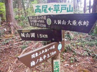 - 高尾山口→10分→登山口→10分→四辻→30分→廃鉄塔→30分→草外山→30分→榎窪山→5分→三沢峠→35分→草外山→10分→拓殖大学尾根分岐→45分→住宅街登山口→15分→初沢山→10分→高尾天神社→10分→高尾駅