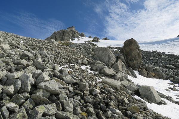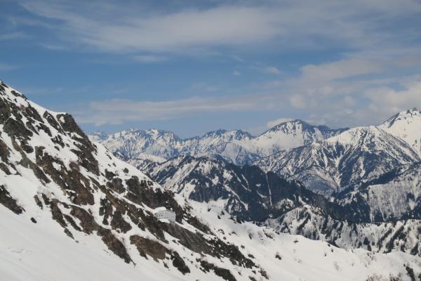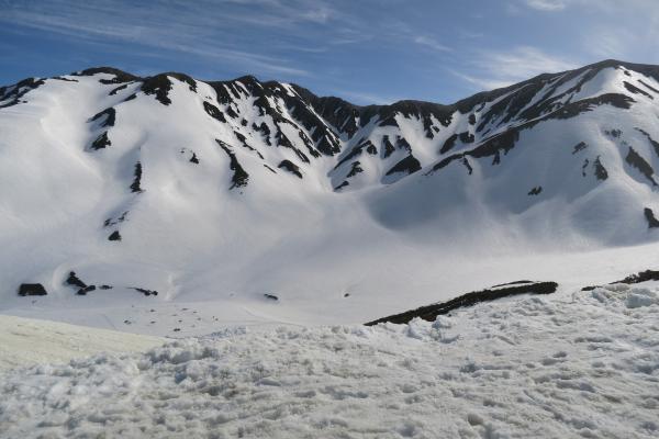 - 稀に見る早さで融雪が進んでいるとアルペンルートの方がおっしゃっていました。稜線部は夏道がかなり露出しています。ただ、沢筋はたくさんの雪で埋まっており山が低くなったように見えました。