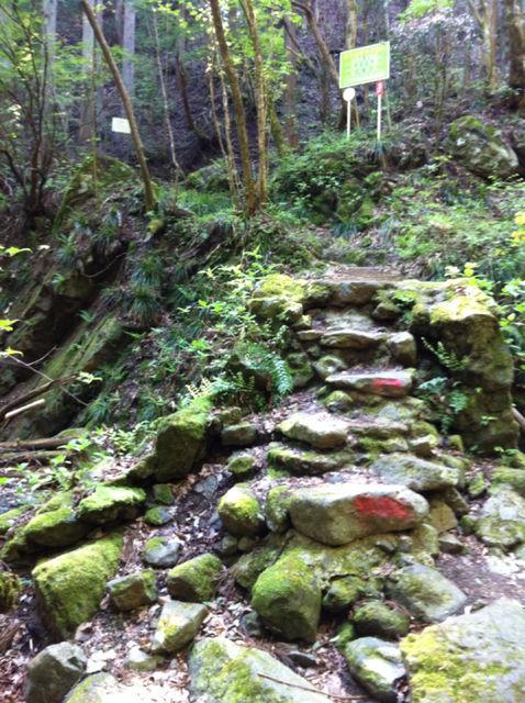 この標識は山の中もずっとあり、それ以外にも岩等に赤い印が細かくあり、