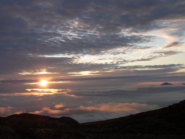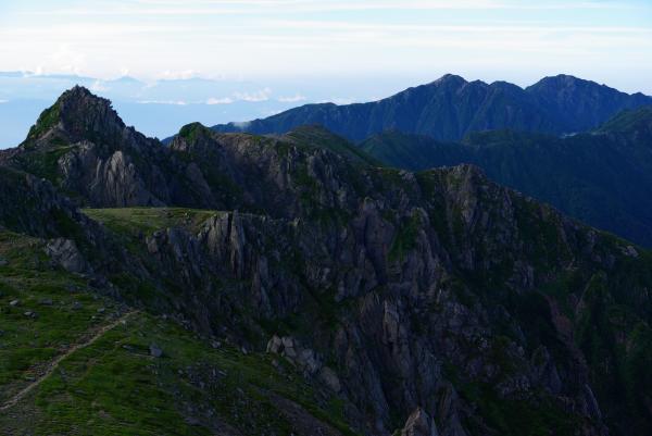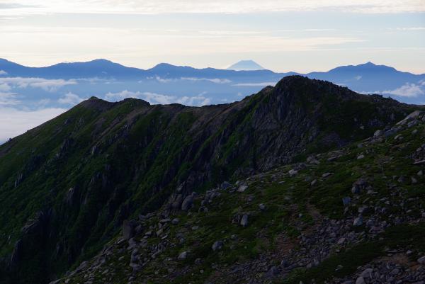 翌朝、うっすらと目が覚めると部屋の中にまさかの太陽の光が!予報は良くなくて、夜も雨の音が止まずまったく期待していなかったので、一際きれいに見えました。5:30の朝食の後、すぐに木曽駒ケ岳へ向け出発。山頂までの間、前日何一つ見えなかった三ノ沢岳・宝剣岳がクッキリと姿を見せてくれました。