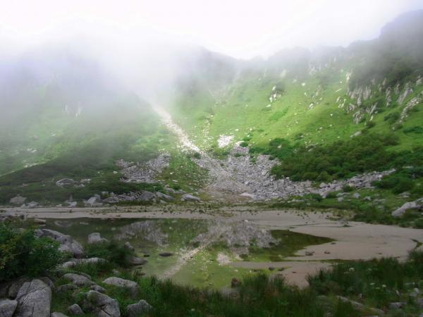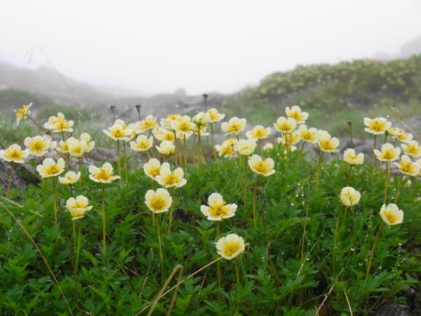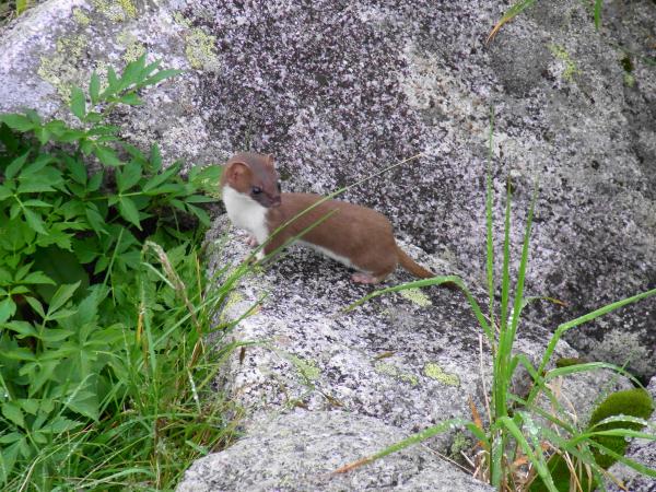 濃ヶ池に着く頃にはまたガスに覆われ始めがっかりしてコーヒーを飲んでいると、なんとオコジョを発見!こちらを怖がることもなく(?)ものすごいスピードで10分間ぐらい周りをぐるぐる走り回っていました。何枚か至近距離で写真を撮ることができたのですが、意外と獰猛な顔つきでビックリ。実は肉食でノウサギやライチョウを襲うことも(!)アップした写真は比較的かわいくとれた一枚です(笑)
