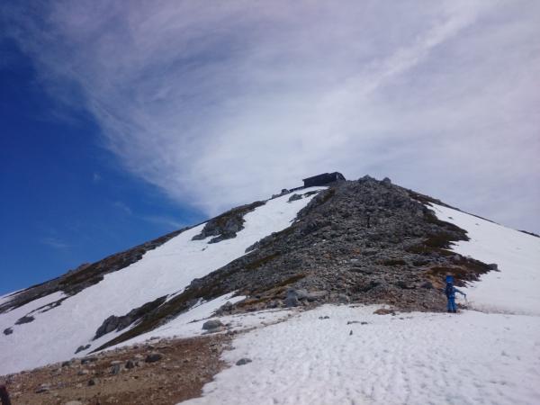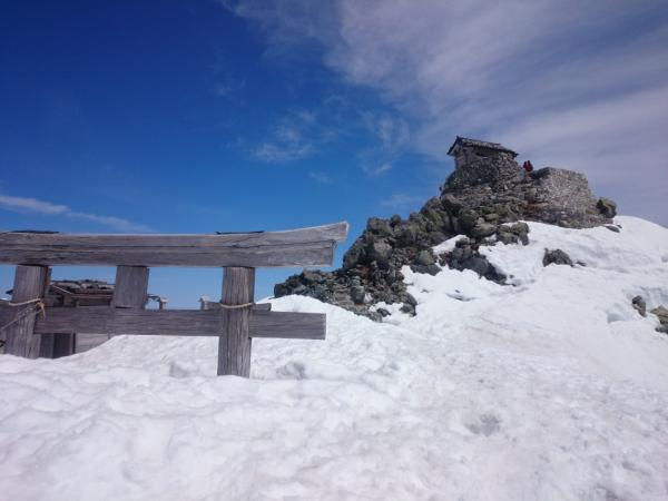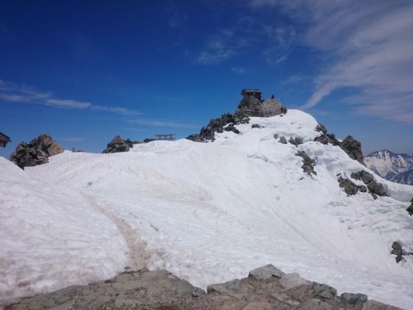 一の越~雄山 ほぼ夏道が見えてます。一か所、数メートルだけ雪が残っていますが、早朝など凍っていなければ大丈夫でしょう。しかし、滑りやすい砂利や拳大の石、大きい岩で構成された登山道です。特に降りの際、下の方に石を落さないように注意しましょう。
