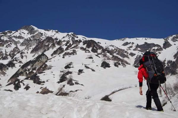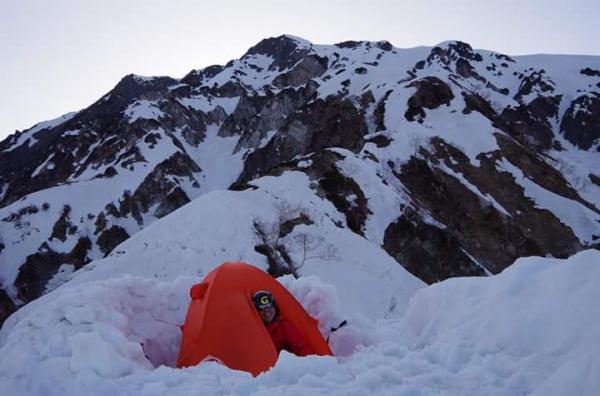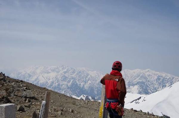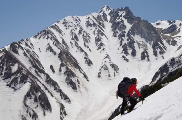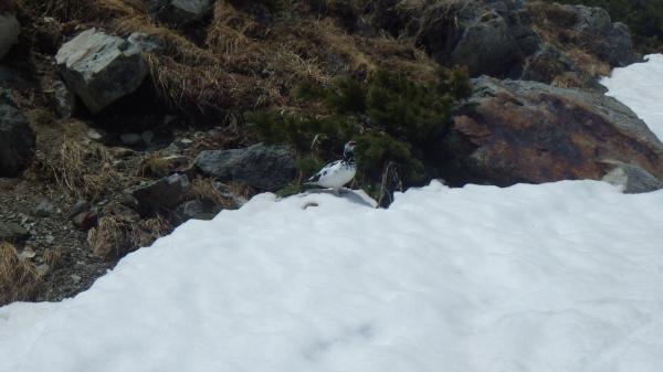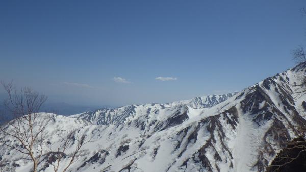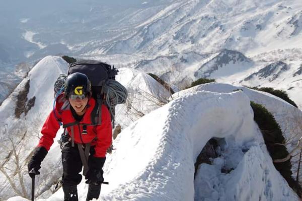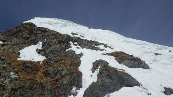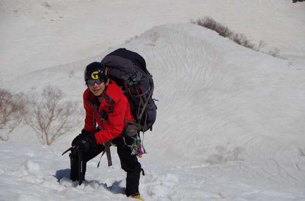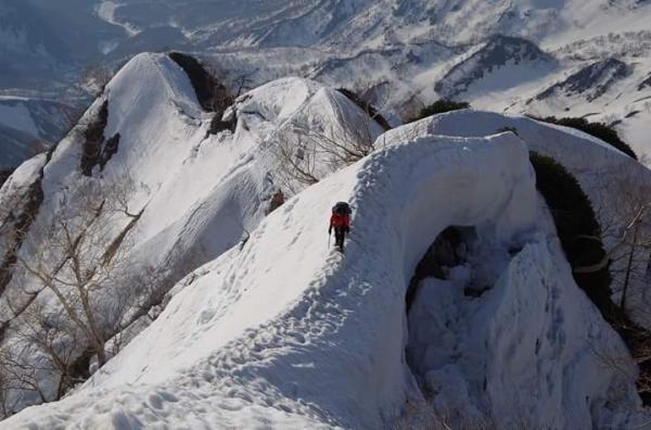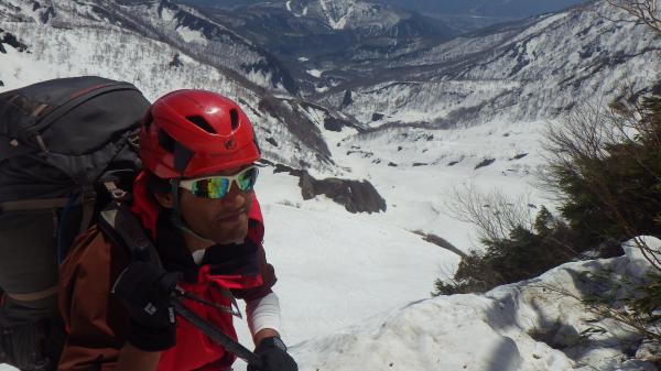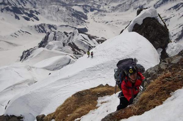 このところの温かさで雪解けが進んでいて、主稜下部はクレパスが沢山ありました。中盤あたりは、雪が付いて無い所もありハイマツの間を抜けたりしました。