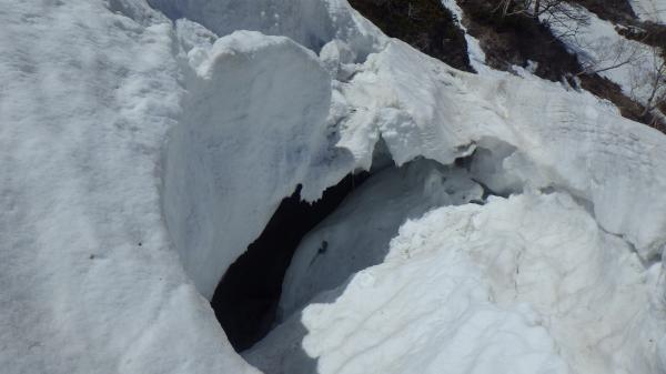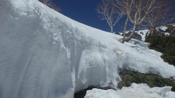このところの温かさで雪解けが進んでいます。日中はかなり雪が緩くなるので、雪崩や落石に注意が必要です。