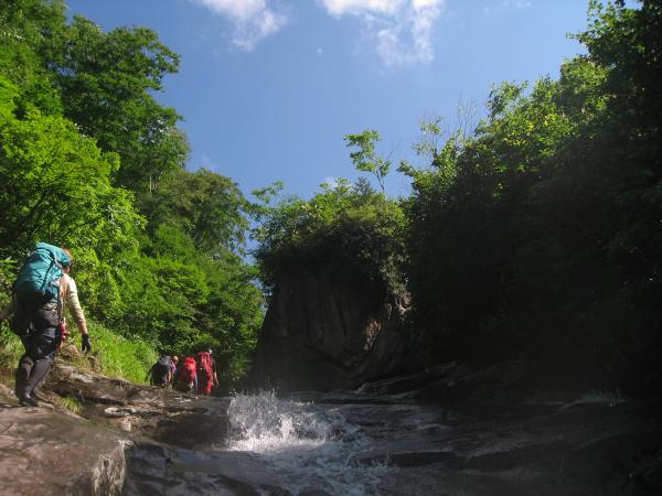 タラタラのセンや大岩・ジジ岩・ババ岩と絶景が続き、最後は岩登りのようなスラブ。時間に余裕を持ってゆっくり満喫したくなる沢登りでした。