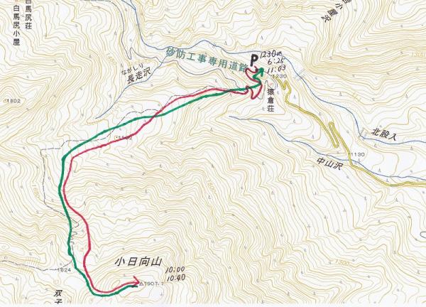 - 猿倉駐車場(180分)小日向山山頂(20分)猿倉駐車場