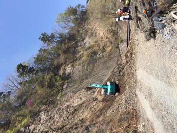 が、土砂崩れの現場へ着いてみると、道がすべて土砂で埋もれ、ガードレールを突き破っていました。