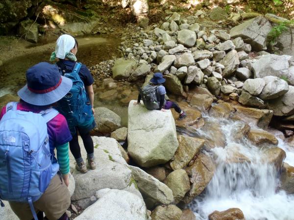 大摺鉢で川を渡る時、緊張します。(橋はありません)