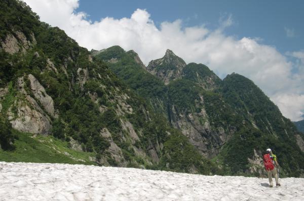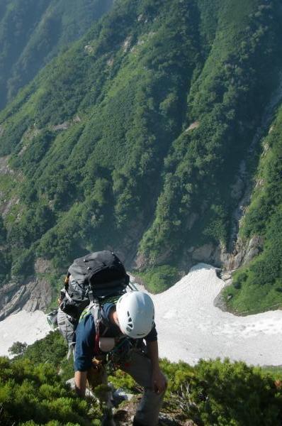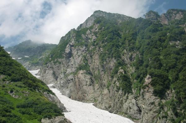 長次郎谷・平蔵谷はクレバス・シュルンドが多く、上部には雪が残っていなかった。また落石も多く観られた。