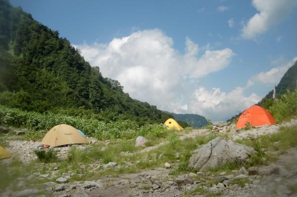 初日はベースキャンプを真砂沢に立てて終了。真砂沢についてすぐ夕立のような大雨に降られました。