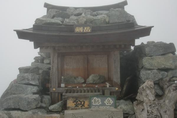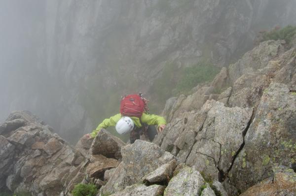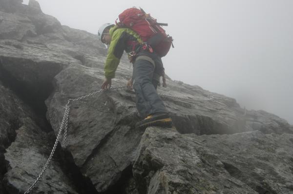 二日目は天気が悪く、Cフェイスに取り付くも全く景色を拝めず、ガスの中を剱岳山頂までめざしました。途中、自分たちの居場所が明確ではなくなりましたが無事山頂へ到着。ベースキャンプに戻るまでに12時間以上歩いたことになりました。
