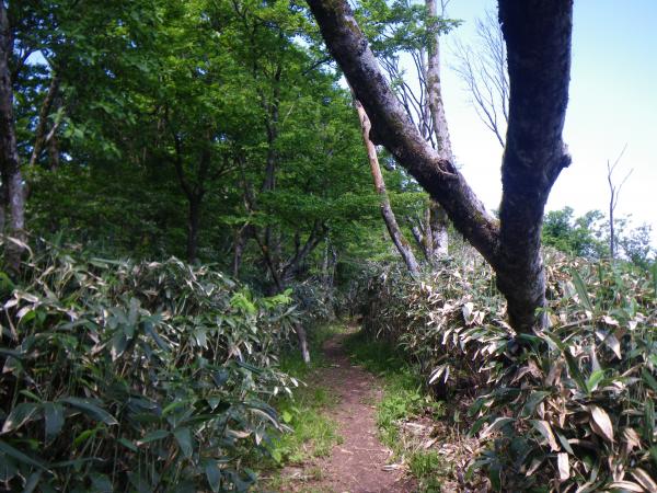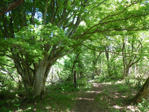 ⑥稜線沿いはなだらかで、広葉樹林のきれいな道です