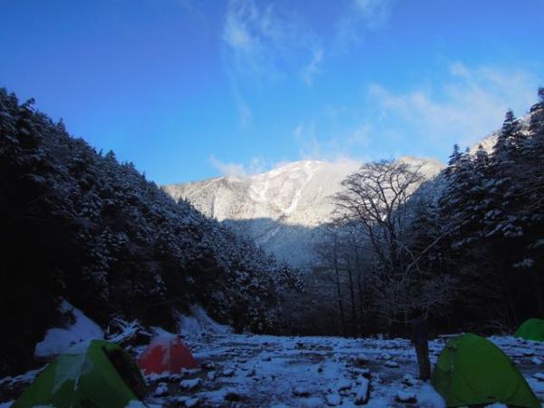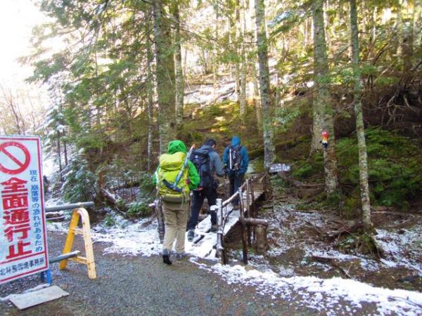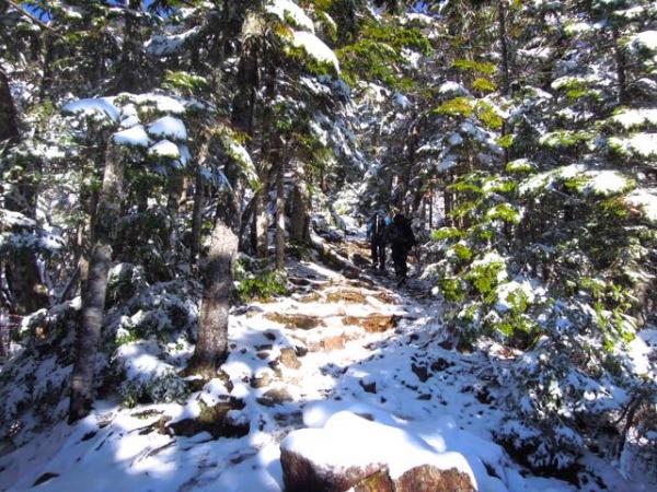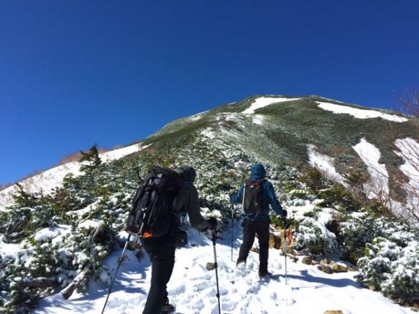 - 未明に雪が降ったため、新雪が積もっておりアイゼンを装着。