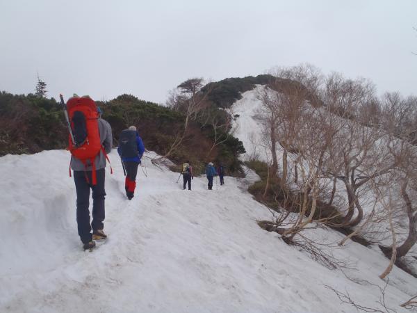 早めの時期であれば雪面を尾根に向かって上がれますが、もうこの時期は遅いですね。