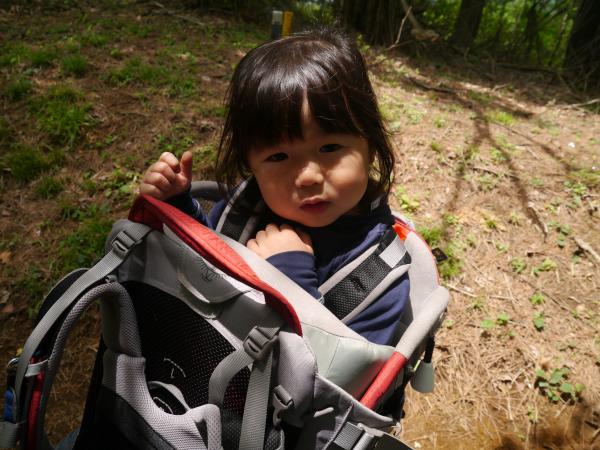 30分ほど大休止し、下ろうとするとグズりだし抱っこをせがまれますが、ベビーキャリーで寝てもらおうと、有無を言わさず乗せて下山開始。案の定娘は背中で爆睡してくれました。