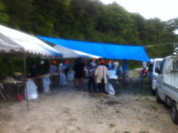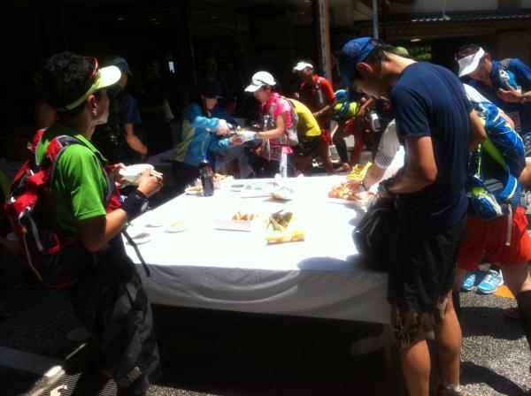 給水所へ続く登りも延々とつづら折り…。途中で立ち止まって足を休める人がここで増えました。登りが緩くなり、登りきると給水所。給水だけではなく食べ物も用意して下さってました!