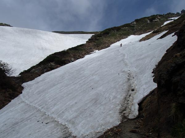 砂防新道:十二曲りから甚之助避難小屋、1750m付近まで残雪 夏道が出ていないので下山時に使用する際はルートに注意が必要