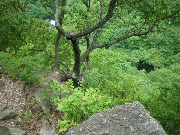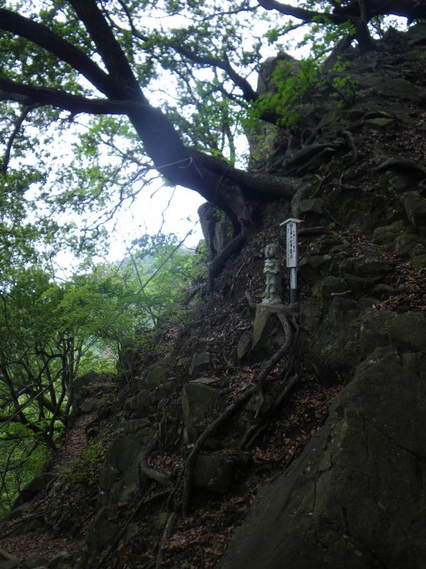 今回は表行場を下り、裏行場を登りました。裏行場の下降もかなり急坂ですが、特に裏行場は最初から急な崖を登ることになり、まるで沢登の高巻き道のようなところで危険です。下りはもっといやな感じで、どこもそうですが、裏のほうが難しいことが多いですね。周辺の山も頂上からの展望はなく、樹林帯に覆われ、どちらかといえば修験道の山のような感じで、左岸の山からの下降もあまりいい道とは言えません。