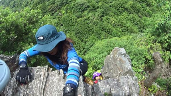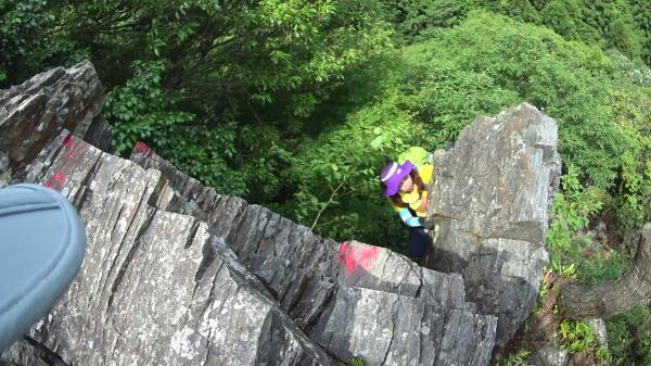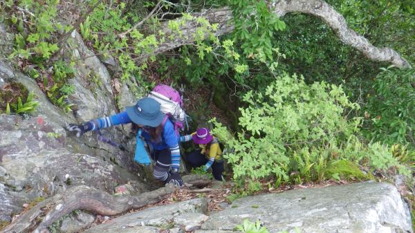 岩場の登りが続きますが赤ペンキでホールドを示してくれています。
