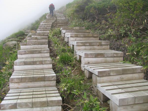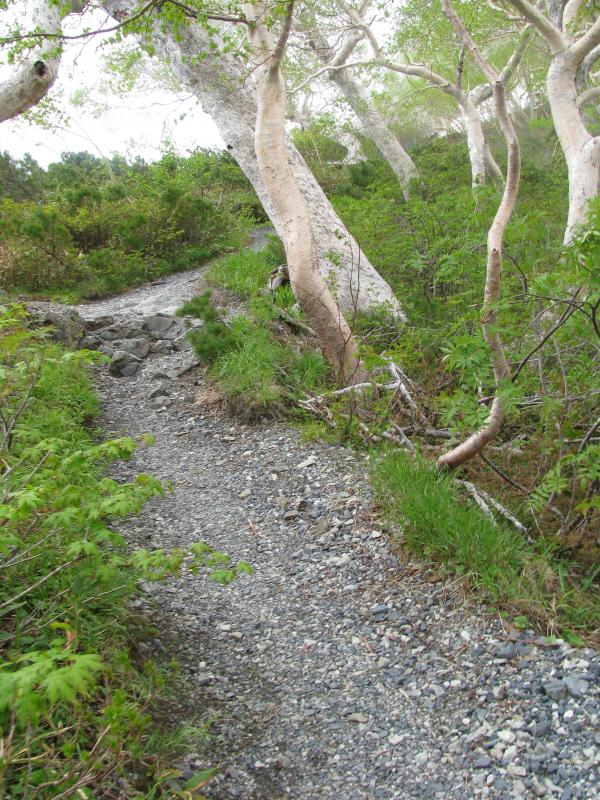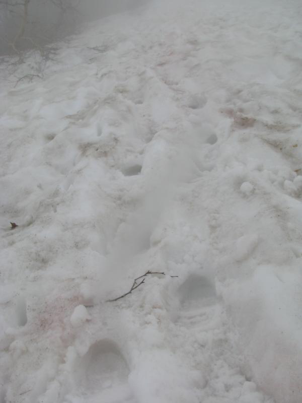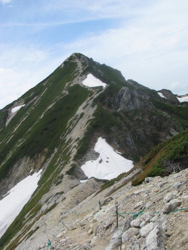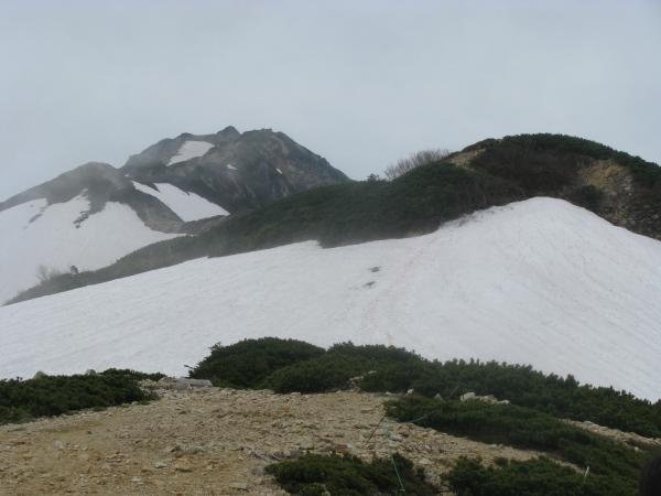 - 八方尾根上部 上の樺より上はまだ夏道が出ていません。尾根を忠実に辿りますが、浮石があるので、特に下りで要注意です。残雪を歩くところが数箇所ありますが、軽アイゼンも不要です。ガスで視界が利かないとルートを誤る可能性があります。