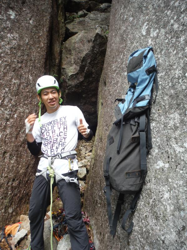 ロープはシングル60mで、カム類も少なく調整。別パーティがいないであろう予想のもと、不要なものはルートの途中に残置して、懸垂時に回収する作戦でした。