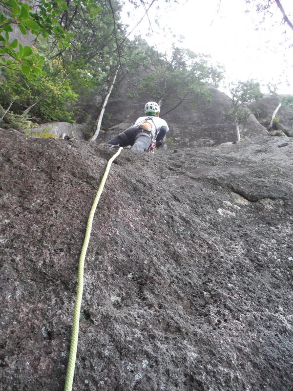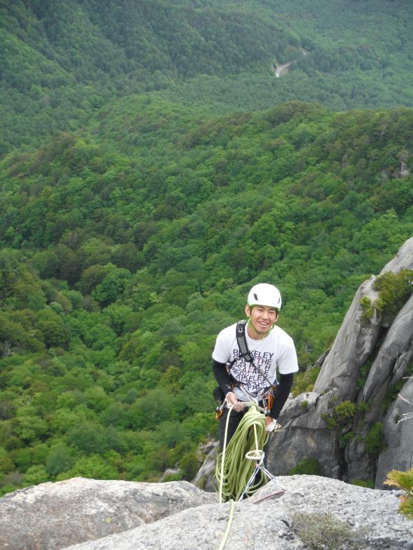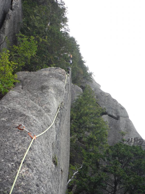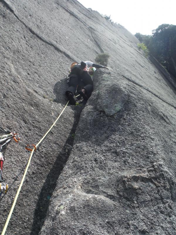 少し濡れた、1ピッチ目と2ピッチ目は、続けて登り、ロープを一杯まで伸ばします。