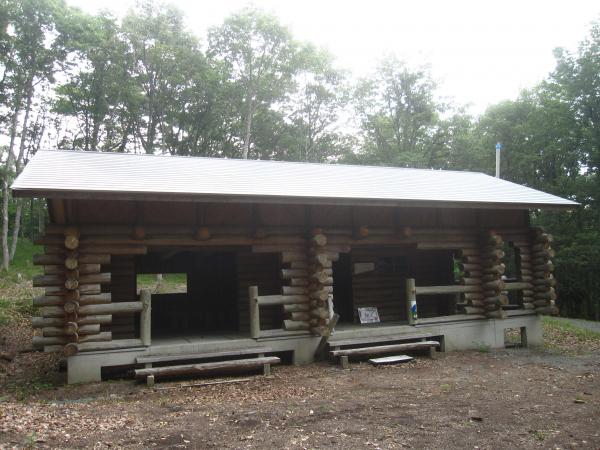 目的地の杉ヶ沢高原までもう少しのところで雨が降り始めたので、ログハウス風の休憩小屋で雨具装着!引き返しました。