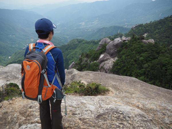 さっっ、気を引きしめてはしごが連続する坊主尾根へと下ります。このコースは20数か所にも及ぶはしごが連続する難コース。まずは小積ダキへ。ここまではゆるやかな下り。この小積ダキからの眺めが最高です。ここでの休憩もいいかも。広々としていてこれから行く象岩も見えます。まさに象のよう。そして有名な象岩のトラバースもしっかり見えてます。