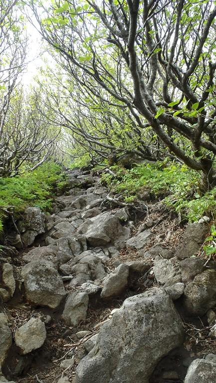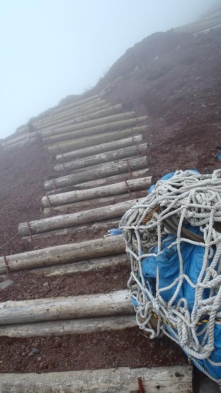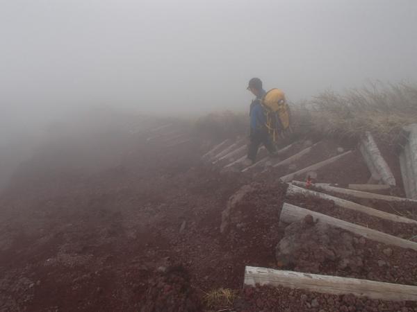 6合目あたりから急な登りとなります。9合目からはがれが多くなり、登山道の崩壊も激しく大きくえぐれているところもあります。登山者の急増なども大きな要因のようで整備補修もされていますが、予算や人での関係でなかなか進んでいないようです。