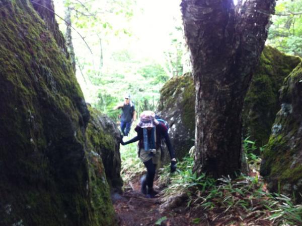 岩と根っこが多い道ですが、雨で濡れるとすべりそうなので気をつけてください