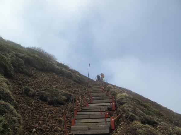 中岳を通り、阿弥陀岳の登り返し。文三郎尾根より急登なので、3点確保で登ります。落石が多いのでヘルメットを携行した方がいいかもしれません。