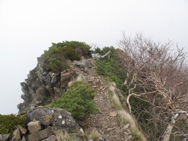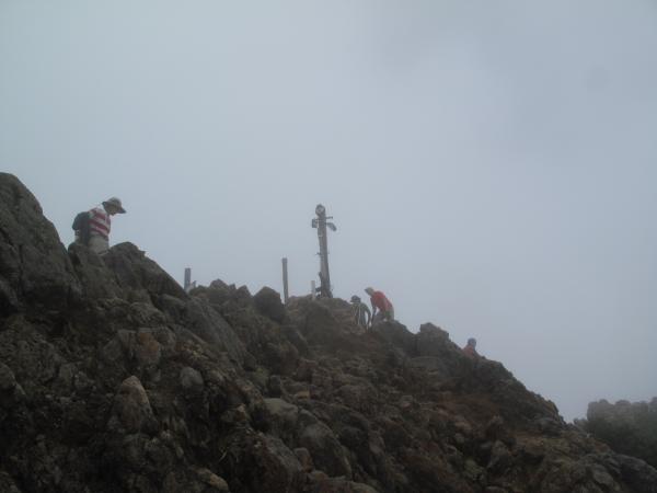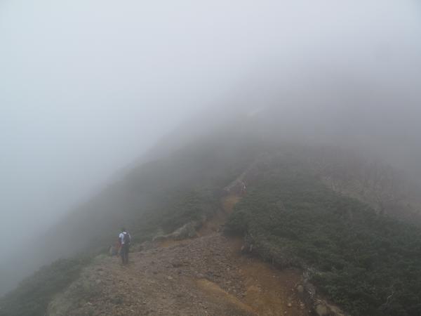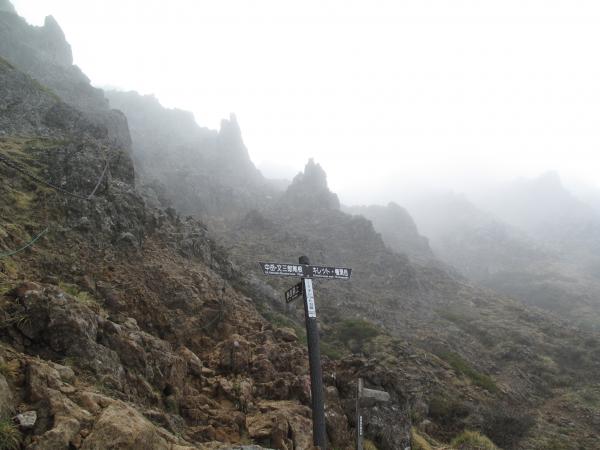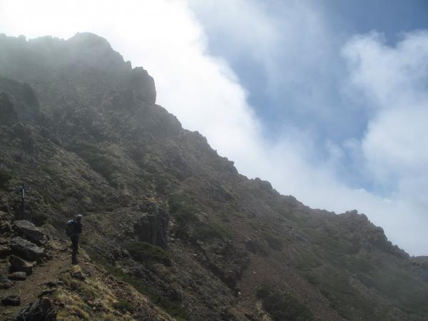 終始曇り空でしたが、行者小屋へ下る途中、雲の隙間から青空バックの赤岳が見えました。